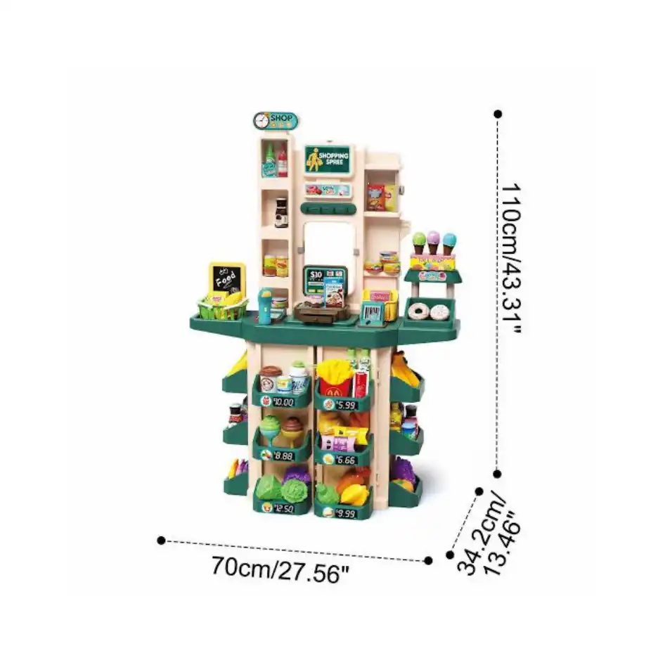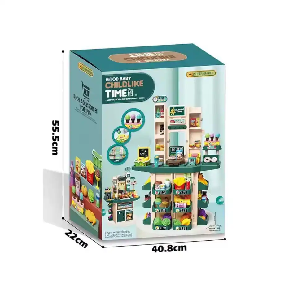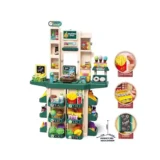 The 71 Pcs Kids Kitchen Set & Supermarket combines a pretend kitchen and mini store in a single play station. With plenty of accessories, play food, utensils, and cartons, it invites children to cook, serve, shop, and scan items just like grown‑ups.