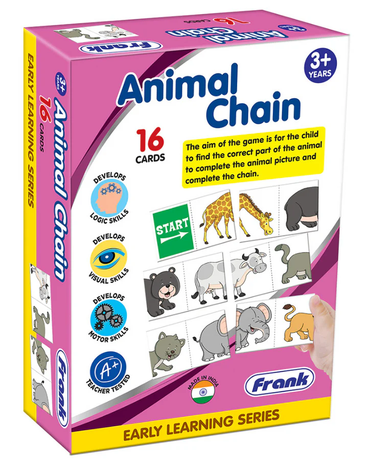 Link, learn, and play with the Animal Chain Puzzle! This innovative sequencing game for kids aged 3+ helps develop fine motor skills and animal recognition through a fun interlocking chain format. Durable, colorful, and perfect for early learners!