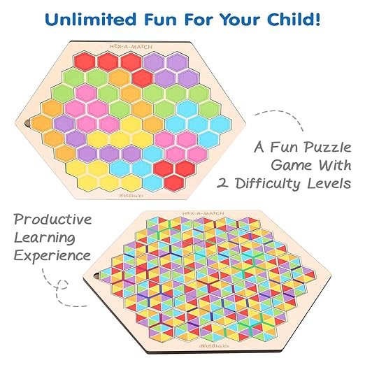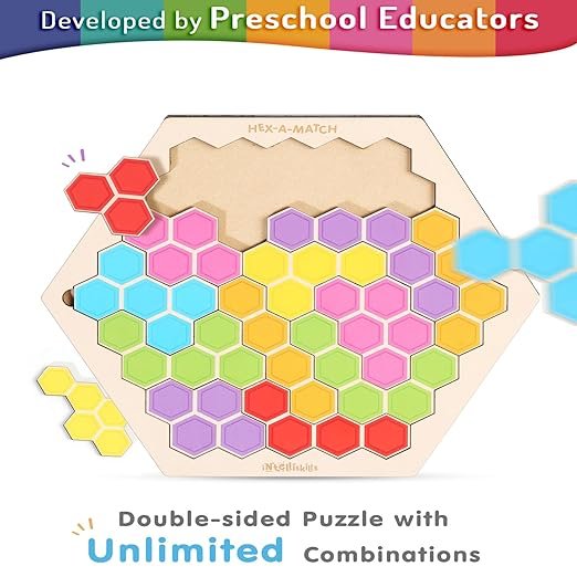 Intelliskills Hex-A-Match takes the classic jigsaw and adds a geometric twist. Unlike traditional puzzles with one fixed solution, this hexagon-based challenge encourages children to experiment with patterns, colors, and shapes, making it an excellent tool for cognitive development.