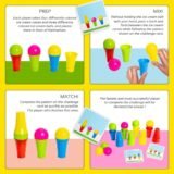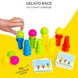 This delightful ice cream-themed game challenges players to quickly match colored ice cream balls with corresponding cone colors while following pattern cards. The game features the sequence “PREP, MIX, MATCH!” – players prepare by setting up their cones, mix the ice cream balls, then race to match the pattern shown on challenge cards. The fastest and most successful player wins! This engaging game includes colorful plastic ice cream cones in red, green, blue, and yellow, along with matching colored balls. Perfect for developing color recognition, pattern matching, hand-eye coordination, and quick thinking. The competitive element adds excitement while the tactile pieces make gameplay satisfying and fun.